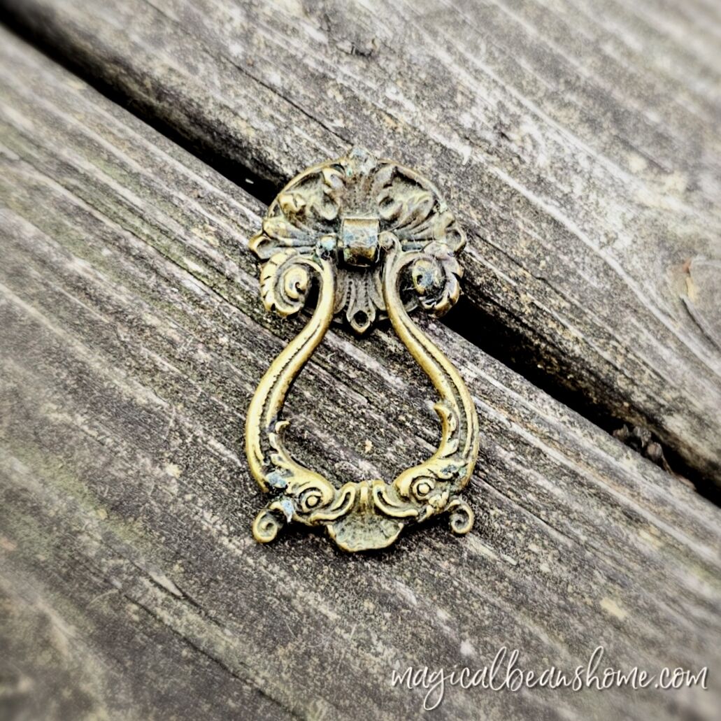 This vintage ring pull crafted by Keeler Brass Co is constructed of solid brass and features 17th century baroque styling! A perfect addition to new furniture that needs dressing up, antique and vintage furniture that may need replacement hardware. Whatever the reason, you'll love these decorative yet functional fingers pulls. They're in good vintage condition, reclaimed yet haven't seen much use. The finish is an antiqued gold, however that can be changed. Find unique period hardware for any project at Magical Beans Home!
